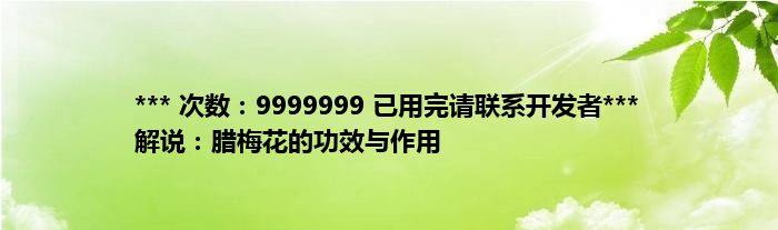 本文*** 次数:9999999 已用完请联系开发者*** 解说:腊梅花的功效与作用到此分享完毕,希望对大家有所帮助。