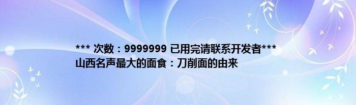 本文*** 次数:9999999 已用完请联系开发者*** 山西名声最大的面食:刀削面的由来到此分享完毕,希望对大家有所帮助。