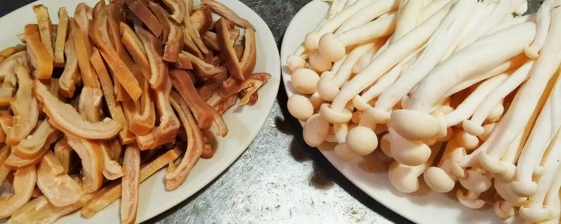 海鲜菇洗净滤干水,用油炸至金黄色备用,猪肚洗净、切丝,煮熟备用,彩椒洗净切条备用。