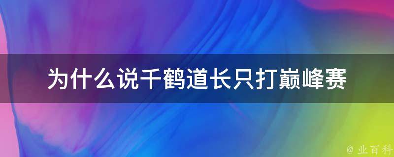 千鹤道长只打巅峰赛是一个互联网上的梗,常见于游戏圈中,指的是游戏中的一种对战模式。这个梗的来源是因为千鹤道长在电影《先生》中表现出了非常高的武技,但每次对决的对手都比他强大,因此人们常常用千鹤道长来比喻碰到比自己强的对手,所以千鹤道长只打巅峰赛,表示只有比自己强的人才有资格与他进行对战。