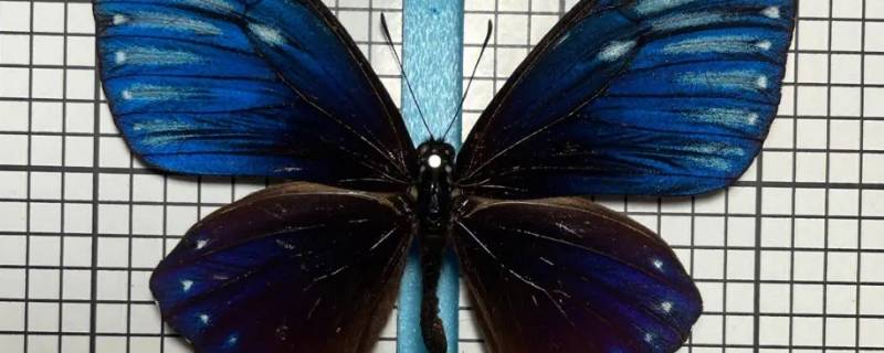 有棕色、紫色和蓝色的蝴蝶是翠蓝斑凤蝶。翠蓝斑凤蝶翼展约10-12cm,雌蝶略大于雄蝶。触须、头部和胸部为黑色,腹翠蓝斑凤蝶(雄蝶)部呈黑色,有白色斑点。雌蝶前翅呈棕褐色,两侧有7-8个白色长斑,由大到小排列,中间有一个大白色斑点;后翅为棕色,两侧有6-7个白斑。雄蝶前翅呈棕褐色,两侧有大片蓝紫色区域,并布有7-8个白色斑点,由大到小排列,中间有一大白色长斑;后翅为棕褐色,两侧有6-7个白斑。