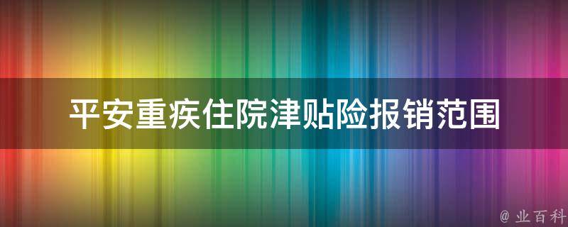 平安重疾住院津贴险报销范围包括恶性肿瘤、心脏病、脑血管病等多种重大疾病,保险公司在被保险人确诊患有上述疾病并住院治疗时,会按照合同约定给予一定的住院津贴。需要注意的是,保险金申请需要提供相关证明和资料,例如住院收据、费用清单等。