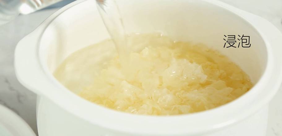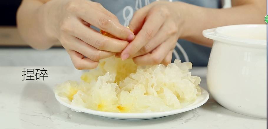 4、将捏碎的银耳、莲子、枸杞、冰糖放入炖盅,加适量清水。