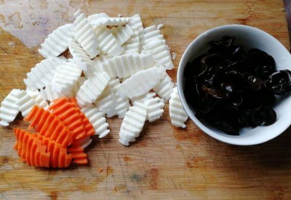 3、胡萝卜去皮洗净切片。泡发的黑木耳洗净,冲掉沙粒沥干水分备用。