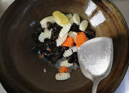 7、翻炒一分钟后,倒入黑木耳继续翻炒。
