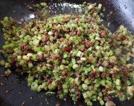 最佳答案准备食材:牛肉250克、芹菜500克、盐适量、料酒适量、生抽适量、姜3片、朝天椒3个、麻椒油5克、花椒面5克、胡椒面5克、孜然1勺、油30克、花椒20粒、蚝油适量。辣椒、姜、芹菜、牛肉剁碎,加入葱碎、胡椒面、麻椒油、花椒面、葱根据个人口味。起锅热油,放花椒,油热后花椒捞出扔掉,放牛肉放料酒炒...