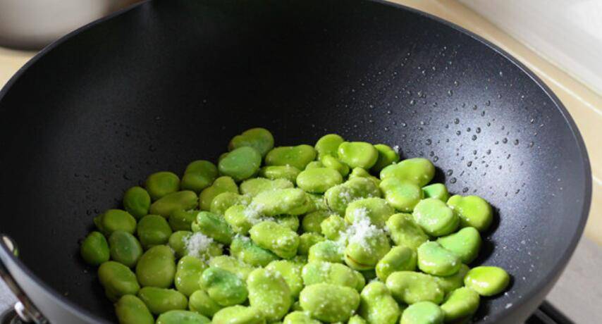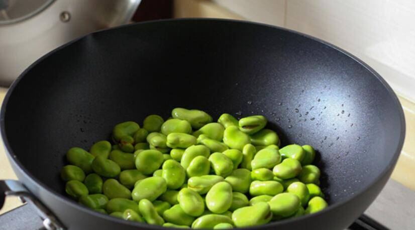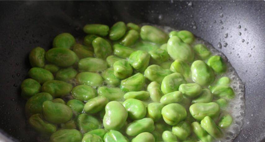 2、炒锅烧热后放油,下蚕豆快速翻炒。