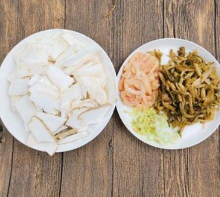 2.杏鲍菇切片,鸡胸切丝,黄花菜截一下,葱花、姜末。
