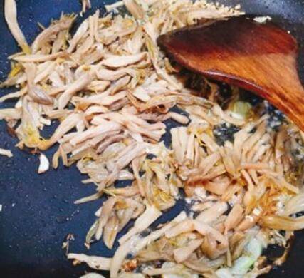 6.起锅,直接放入杏鲍菇,干煸。杏鲍菇煸的时候会出水,煸至边角微黄。