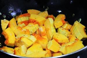 5、倒入南瓜翻炒,加适量的盐,再倒入适量的水加盖烧。