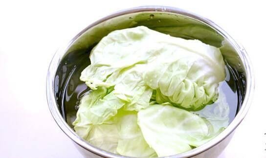 4、把卷心菜的叶子一叶叶地剥开,放清水里浸泡十分钟,清水里放一点点盐,浸泡好以后,再用清水洗净。