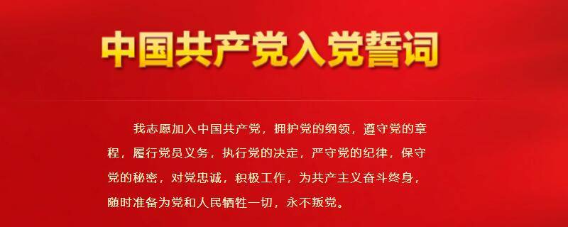 《中国共产党章程》第一章第六条规定:预备党员必须面向党旗进行入党宣誓。誓词如下:我志愿加入中国共产党,拥护党的纲领,遵守党的章程,履行党员义务,执行党的决定,严守党的纪律,保守党的秘密,对党忠诚,积极工作,为共产主义奋斗终身,随时准备为党和人民牺牲一切,永不叛党。