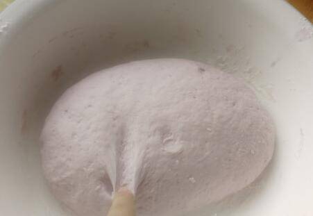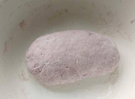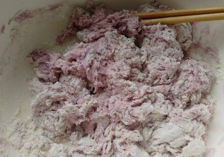 面粉里加入酵母粉,倒入紫薯汁用筷子搅成面絮;