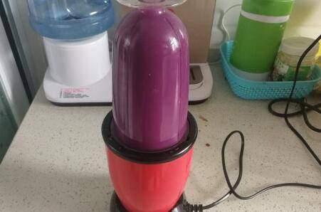 将紫薯打成汁,不要太稀也不要太稠,我们要用这个和面的,可能打一杯不够用,我们可以多打两杯;