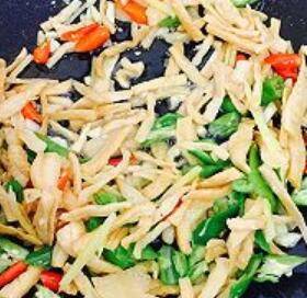 9、炒至萝卜干焦黄,放下小红辣椒,翻炒十秒,放下杭椒,姜丝、腊肉、继续翻炒,中途加入适量的酱油和生抽、青蒜、翻炒两至三分钟,放点鸡精提味。