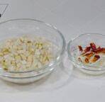 2、泡发好的萝卜干切成小丁,葱切葱花,辣椒掰成小段。