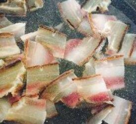 6、油下锅,将沥干水分的腊肉完全煸出油,然后捞起,装盘备用。