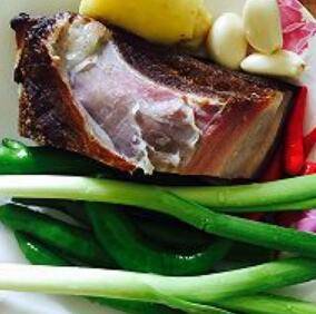 2、腊肉,杭椒、小红辣椒、大蒜、青蒜、姜。