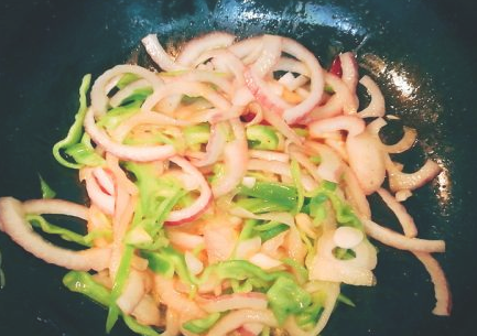 锅里再次放油, 加入洋葱、青椒炒到八成熟。