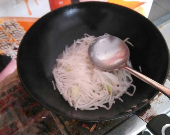 锅中放油烧热,入花椒、葱花、爆香,放入白萝卜丝,翻炒,放盐、清水,加点醋,即可出锅。