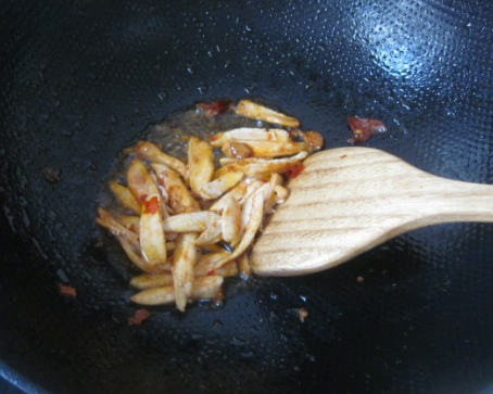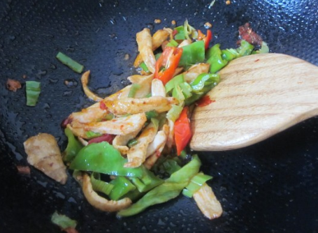 加入葱姜尖椒炒香;