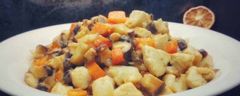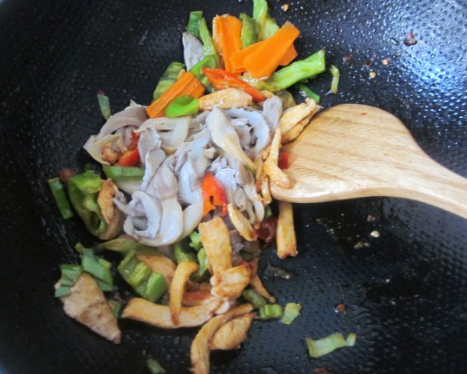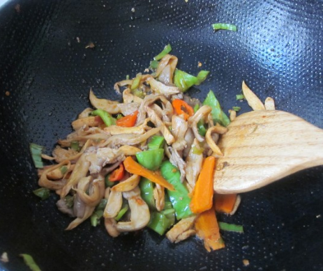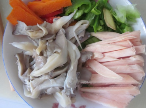 鸡脯肉切宽条,尖椒、胡萝卜切宽条,葱姜切片,蘑菇挤干水分;