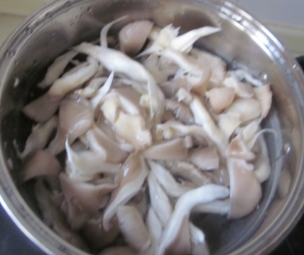 蘑菇洗净撕成细条,烧水过一下水;