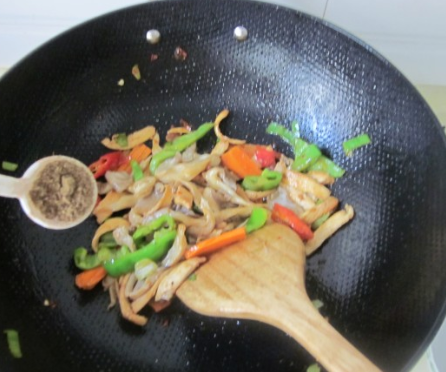 加半勺花椒面、盐炒匀,烹入少许醋;