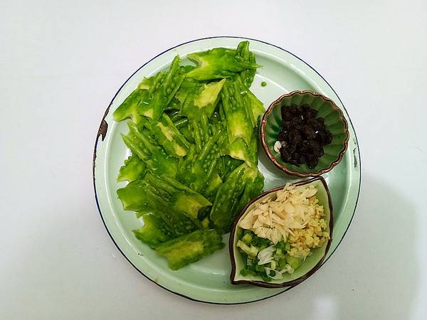 1、苦瓜洗净,去瓤,片成片备用,葱姜蒜切末、豆豉切粒。