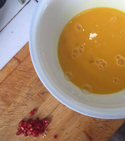 2、鸡蛋打散,辣椒切丁备用。