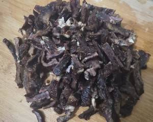 1、生晒的牛肉干泡一夜,洗好切条。