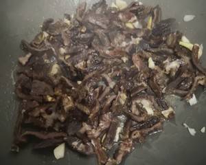 2、姜蒜切碎,芹菜切段,热油下姜蒜,爆香后加入牛肉干。