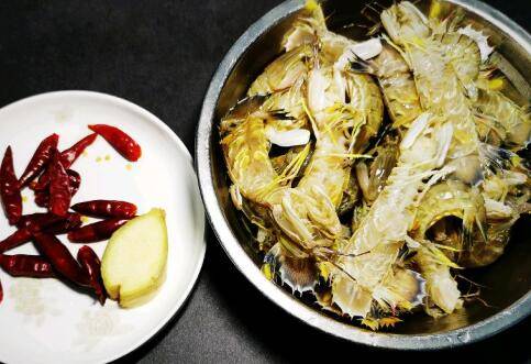 生姜切片,干辣椒剪碎,濑尿虾用清水洗干净。