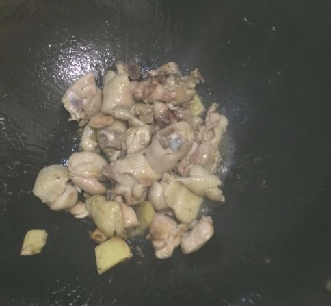 再将切好的鸡腿倒入,不停翻炒,大火;