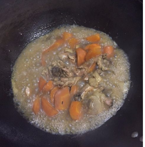 加适量水,淋上料酒、酱油,加入胡萝卜块儿,翻炒均匀;