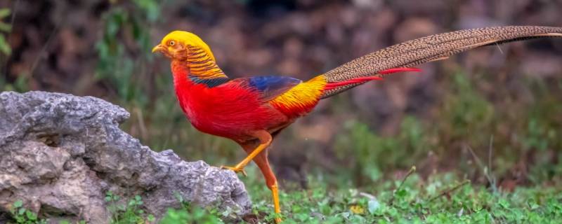 红腹锦鸡是国家二级重点保护野生动物。红腹锦鸡(别名:金鸡)是雉科锦鸡属动物,《世界自然保护联盟》低危物种。体长59~110cm,尾特长;雄鸟羽色华丽,头具金黄色丝状羽冠,上体除上背浓绿色外,其余为金黄色,后颈被有橙棕色而缀有黑边的扇状羽,形成披肩状;下体深红色,尾羽黑褐色,满缀以桂黄色斑点;雌鸟头顶和后颈黑褐色,其余体羽棕黄色,满缀以黑褐色虫蠢状斑和横斑,脚黄色。喜成群活动,以野豌豆、野樱桃、青蒿、蕨叶、野蒜、悬钩子等植物为食。其为中国特产种,分布于中国青海东南部,甘肃、陕西秦岭山脉、四川,湖北西部、云南东北部、湖南西部及广西东部。