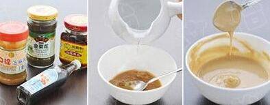 取一只大碗,放入芝麻酱,将温水一点点的加入,边加水,边用筷子朝一个方向不停的搅拌,直到把芝麻酱调到稀稠合适的状态;