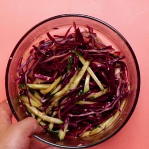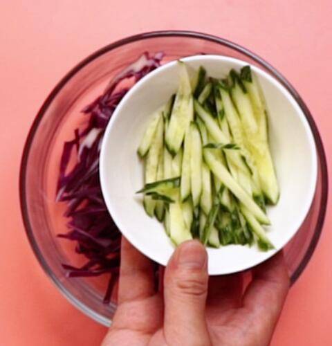 3、容器中倒入紫甘蓝,黄瓜丝。