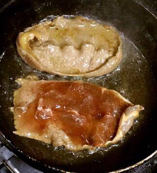 4、由于肉吸收了酱料,短时间煎制能让汁水流失很少,所以肉质非常嫩,一分钟就煎好了四片牛肩肉。
