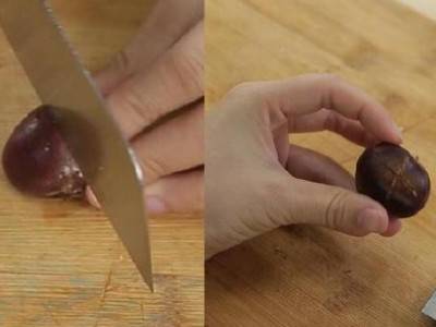2、切花刀:用刀在板栗上面切十字刀口,不需要太深,如此方便入味,还能快速裂口煮熟。