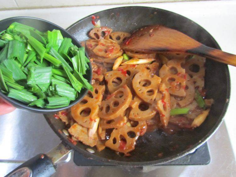 3、炒出红油后下入其它大料翻炒,翻炒出香味后加入适量的水,放入牛肉和藕进去。