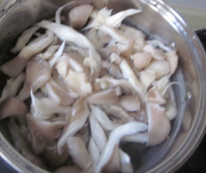 蘑菇洗净撕成细条,烧水过一下水;