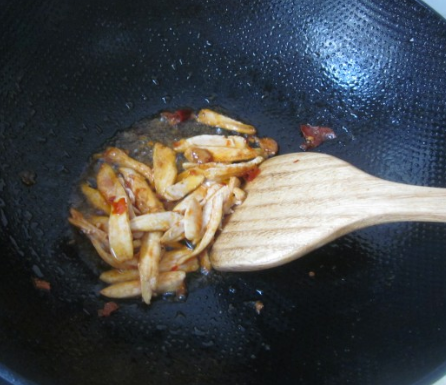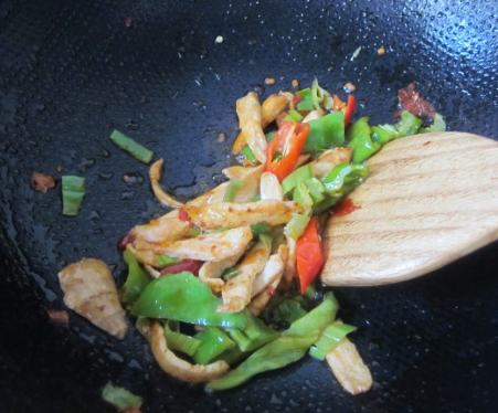加入葱姜尖椒炒香;