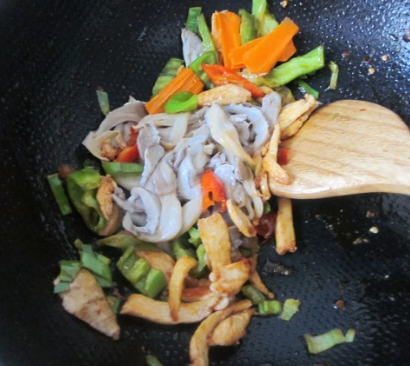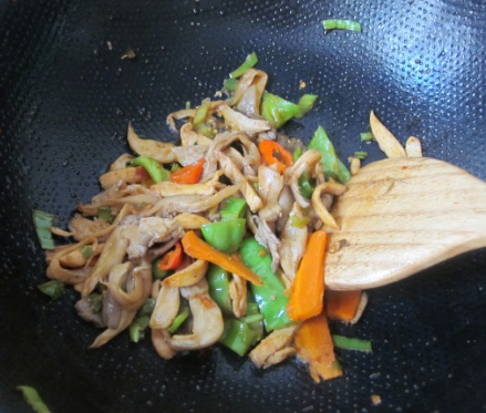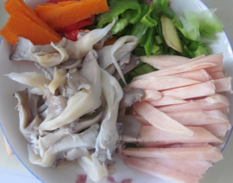 鸡脯肉切宽条,尖椒、胡萝卜切宽条,葱姜切片,蘑菇挤干水分;