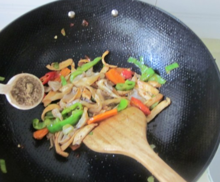 加半勺花椒面、盐炒匀,烹入少许醋;