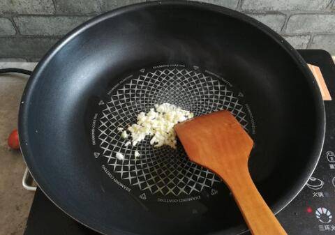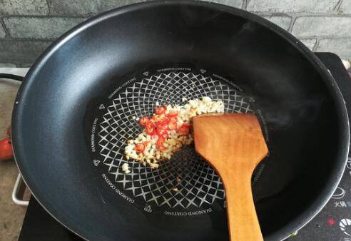 9、加入辣椒碎,炒到蒜米微微发黄。