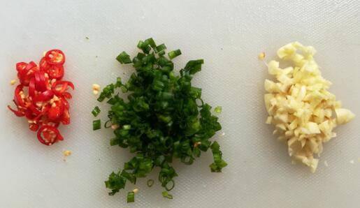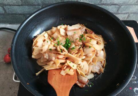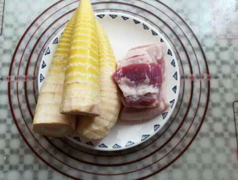 用料:五花肉250克、春笋3根、蒜米4瓣、辣椒1个、盐2克、生抽5克、蚝油10克、食用油20克、葱花适量。