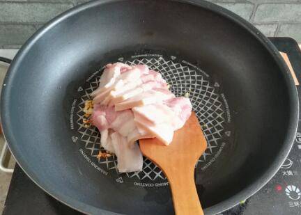 11、再加入15克油,五花肉翻炒到肉片边缘有轻微焦黄。