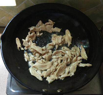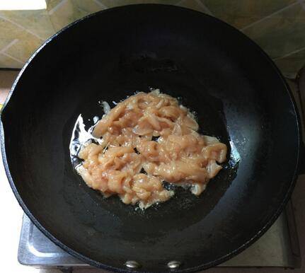 锅中注入食用油,5成热的时候,下鸡胸肉。