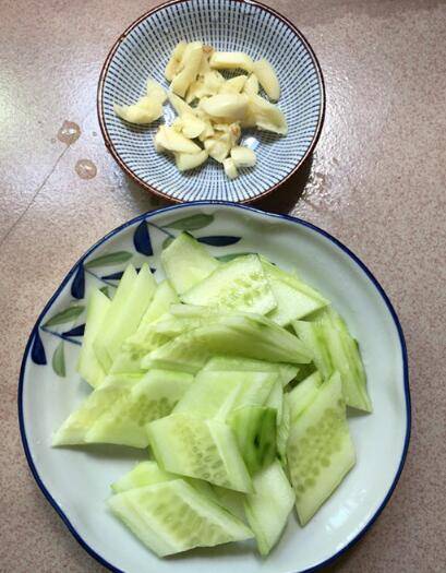 黄瓜切皮斜切片,大蒜剁碎。